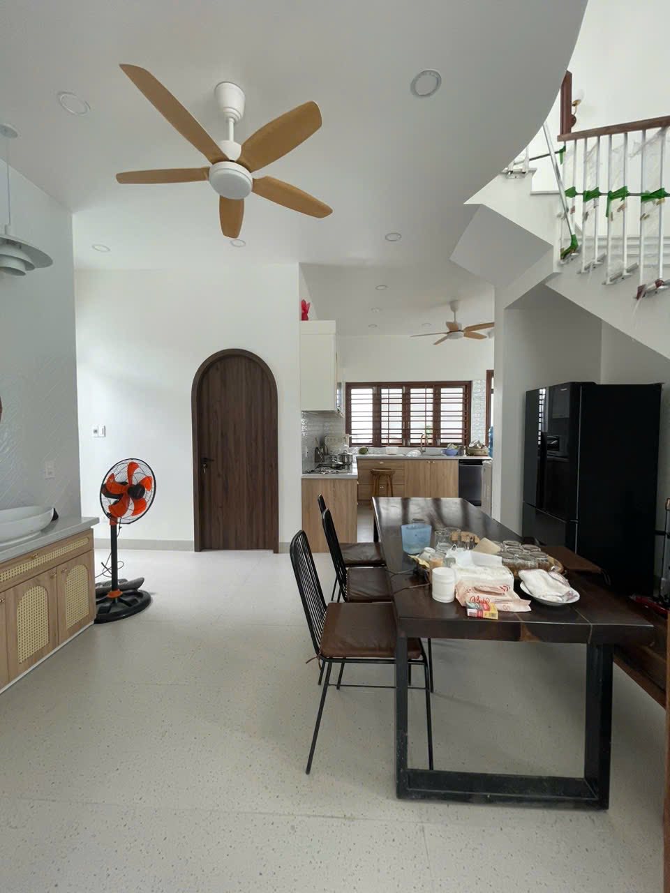 Nhà diện tích 6x15m, 02 mặt tiền với kiến trúc vuông vức mạnh mẽ pha với nhũng vòm cong uyển chuyển khá là phù hợp tính cách của anh chủ nhà.